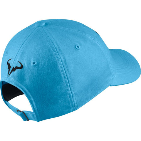 NikeCourt AeroBill H86 Rafa Tennis Hat Nike AeroBill H86 Rafa Tennis Hat is made with sweat-wicking AeroBill technology for lightweight, breathable comfort. Nike AeroBill technology wicks sweat away with lightweight breathability. Terry sweatband absorbs sweat and wicks it away from your skin. One-hand quick closure on the back for easy adjustability. Embroidered eyelets provide ventilation. The bull logo is embroidered on the front.