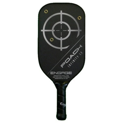 The Poach Infinity LX Composite Paddle measures a USA Pickleball-maximum of 17.0" in total length, by 7.0" in width, with a 5.25" handle length and medium (4.25") handle circumference. The grip is Engage's ultra-perforated cushion grip that prevents sweat from accumulating against the skin and offers a noticeable degree of tackiness. The Infinity LX is engineered with variable flex technology, which results in a forgiving touch of softer shots while unleashing all the power you can handle on groundstrokes and overheads.