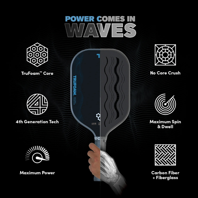 The CRBN TruFoam Waves is the most powerful expression of foam-core performance to date. Built with 100% TruFoam technology and an all-new Waves core design, this paddle delivers explosive put-away power without sacrificing the plush feel, dwell time, and control TruFoam is known for. Soft on touch shots and resets, then ferocious when you accelerate, Waves stores and releases energy like a tennis racquet—giving aggressive players the confidence to finish points on their terms.
