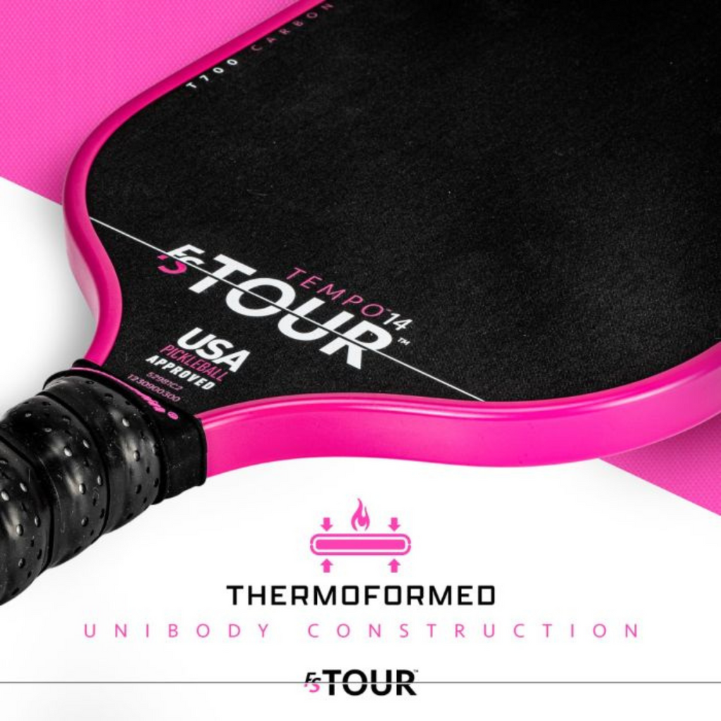 The Franklin FS Tour Tempo Pickleball Paddle in Pink is designed to elevate your game to the next level. Featuring a T700 raw carbon fiber surface, this paddle enhances spin and precision, while its thermoformed, epoxy resin-injected unibody frame increases shot power and stability. The 16mm high-density foam-infused perimeter expands the sweet spot and reduces vibration, giving you more control with every hit.