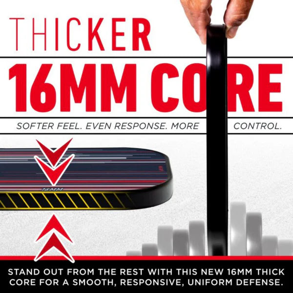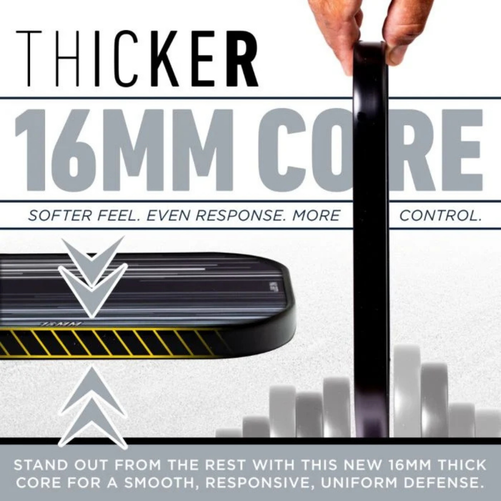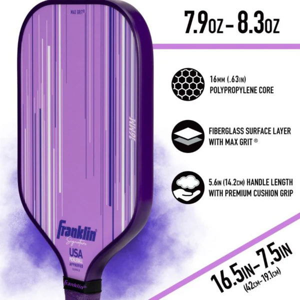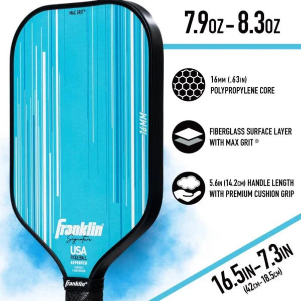 The Franklin Signature Series Pickleball Paddle - 16mm is crafted for players who demand pro-level precision and performance. Featuring MaxGrit textured surface technology, this paddle enhances spin while reducing vibration for greater control on every shot. Its 16mm polypropylene core, paired with a fibreglass face, creates a larger sweet spot, ensuring effortless and consistent contact.