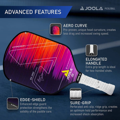 The JOOLA Ben Johns Hyperion CAS 13.5 Graphite Paddle includes a variety of innovative, next-generation technology. The 13.5mm Response Honeycomb Polymer Core provides a large sweet spot with reduced vibration for amazing feedback and incredible touch and control at the kitchen line. With the face of the paddle, JOOLA's Hybrid-Ply Technology process strategically layers multiple composite materials together (two layers of fiberglass + one layer of carbon fiber) for outstanding control and feel, providing great sensitivity for dinks along with power for offensive play from anywhere on the court. The Carbon Abrasion Surface (CAS) utilizes a multi-step, abrasion sand-blasted process which creates a unique, textured surface for increased spin. All these features are integrated into the elongated shape of choice by pro player Ben Johns which provides great reach and follow-through on the court. https://youtu.be/JHx_UXu2VvQ TECHNICAL SPECS