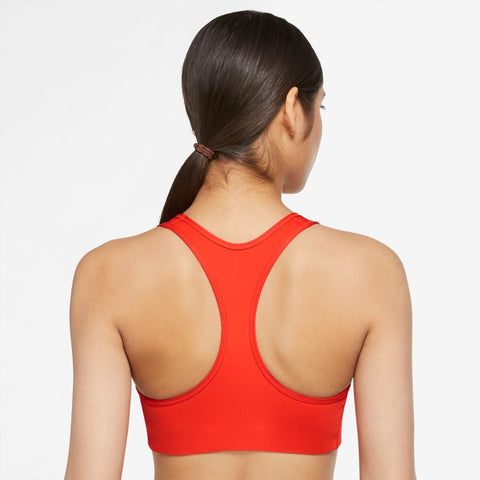 Introducing the Nike Dri-Fit Swoosh Sports Bra in Chile Red/Black, your go-to support for any medium-impact activities. With its removable 1-piece pad designed for easy loading from the top, this bra maintains a smooth, consistent shape even after washing. The top-loading pocket secures your essentials, while the Dri-FIT technology wicks sweat away from your skin for a dry and comfortable workout.