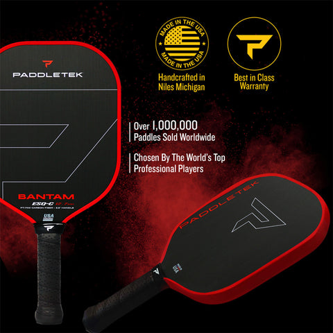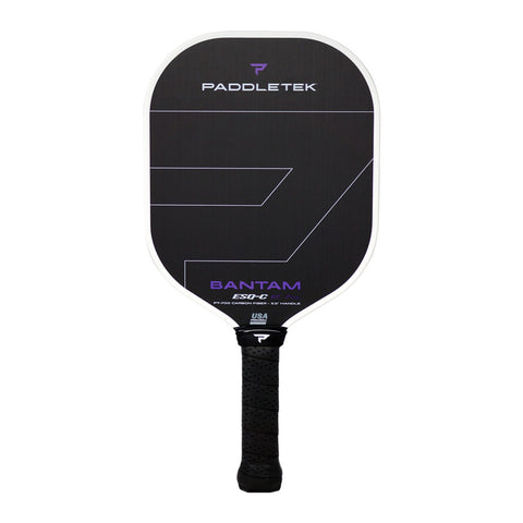 The Bantam ESQ-C was designed in collaboration with pickleball pro, Andrea Koop, to provide a combination of power, spin, and forgiveness. PT-700 unidirectional RAW carbon fiber is combined with Paddletek's more powerful 12.7mm Bantam core to give serious players controllable power and spin capability. A 5.5” handle reduces wind drag and allows for a two-handed backhand, while a large, consistent sweet spot adds finesse to every shot. DISCLAIMER: The Bantam ESQ-C (Esquire) will not be held liable for any distress incurred by your opponent. Court is in session.
