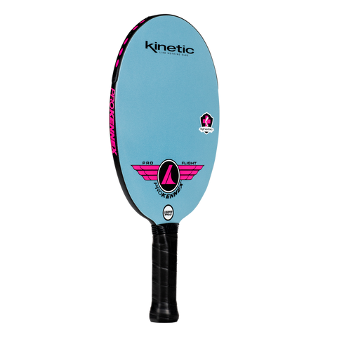 The ProKennex Ovation Flight Pickleball Paddle was designed for speed and optimal reflex. This Ovation Flight paddle is a lightweight paddle that features a unique oval shape that brings a higher percentage of paddle mass along the centre axis, expanding the sweet spot and allowing for a more efficient energy transfer. It features a wind-resistant edgeless construction and thin core technology that further add to this paddle's ability to cut through the air at lightning-fast speeds. Additionally, the Kinetic shock-absorbing system enhances feel and touch to boost your confidence during those crafty kitchen battles. Better yet, there's no need to worry about scuffing up the head of the paddle as ProKennex has designed this paddle with a replaceable Air-O-Guard edge guard- the first of its kind. Speed, comfort, and durability are all on your side with this USAPA-approved paddle!