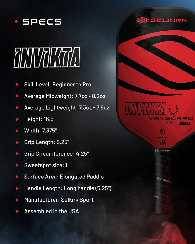 The Selkirk Vanguard Hybrid 2.0 Invikta - Lightweight is perfect for the player that wants an elongated paddle with a long handle for a larger sweet spot and more reach. It is also ideal for a Tennis Player that wants more consistency than a traditional elongated paddle. It is also great for players that determine to give unrelenting speed and consistency during the game. It has a revolutionary technique performance paddle that gives maximum spin and a flawless feel while playing. It enhances playing consistency, and enhanced ball velocity for optimal performance. Featuring the ultimate speed, the greatest impact, and better consistency.