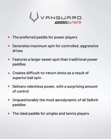This paddle is designed to generate maximum spin for controlled, aggressive drives and it also features a larger sweet spot than other similar power paddles. According to Selkirk, the Vanguard Power Air S2 is unquestionably the most aerodynamic of all Selkirk paddles due to the extra airflow provided by its Air Dynamic Throat located close to the handle.
