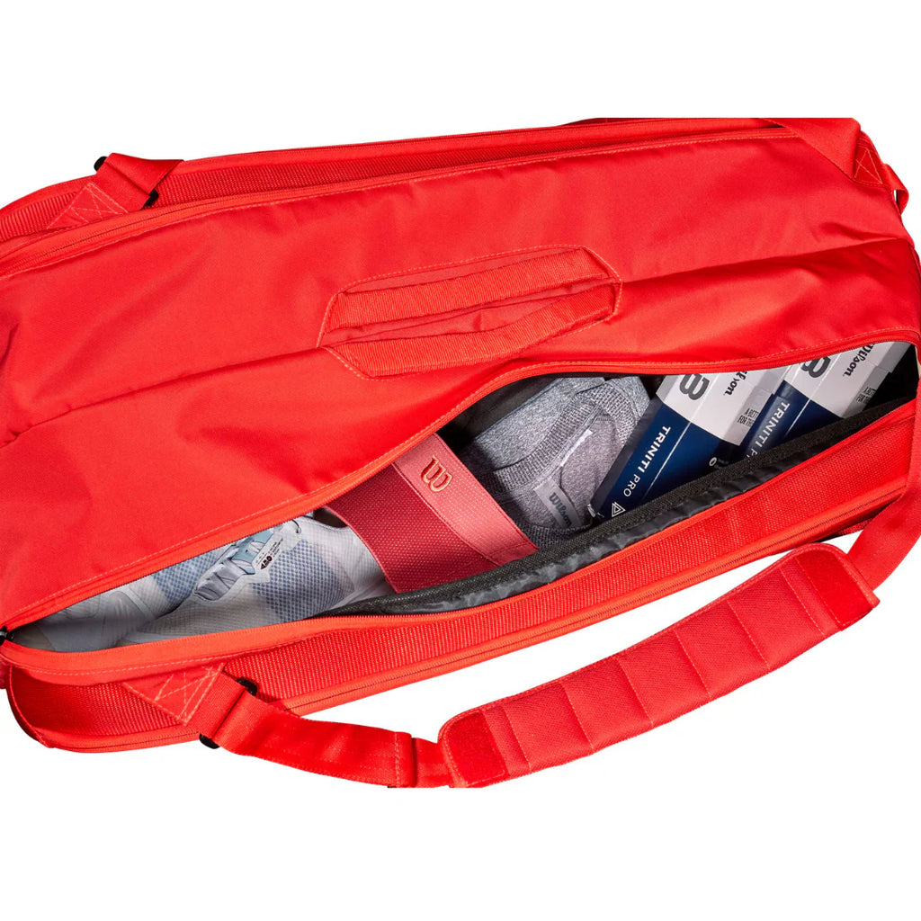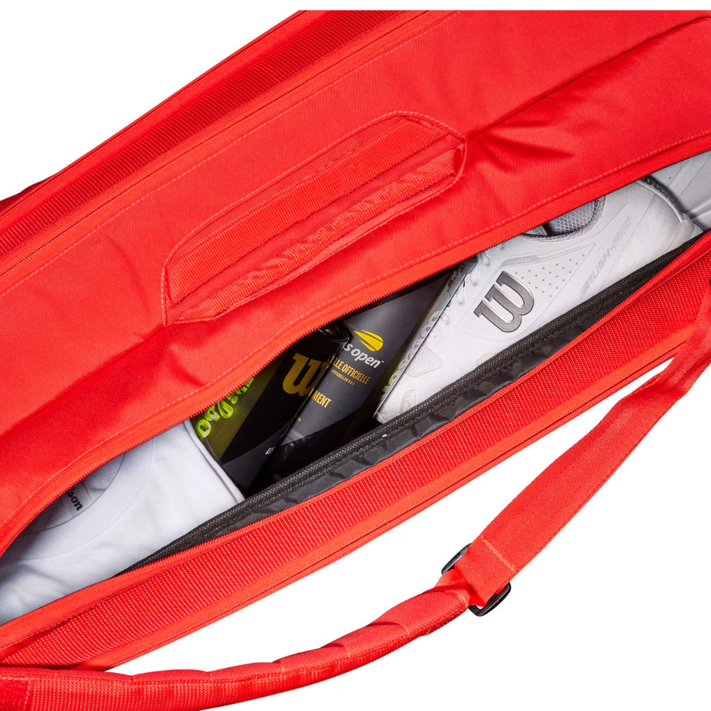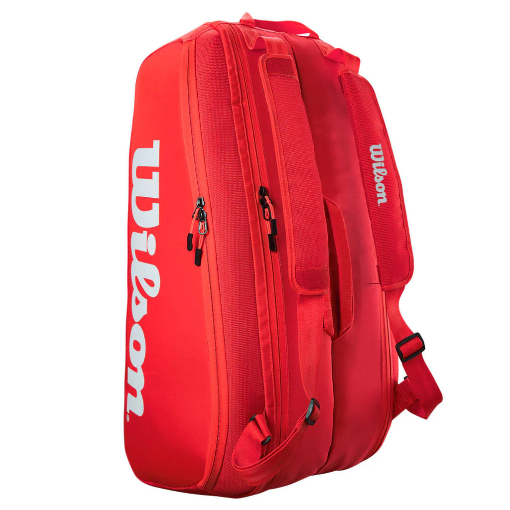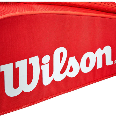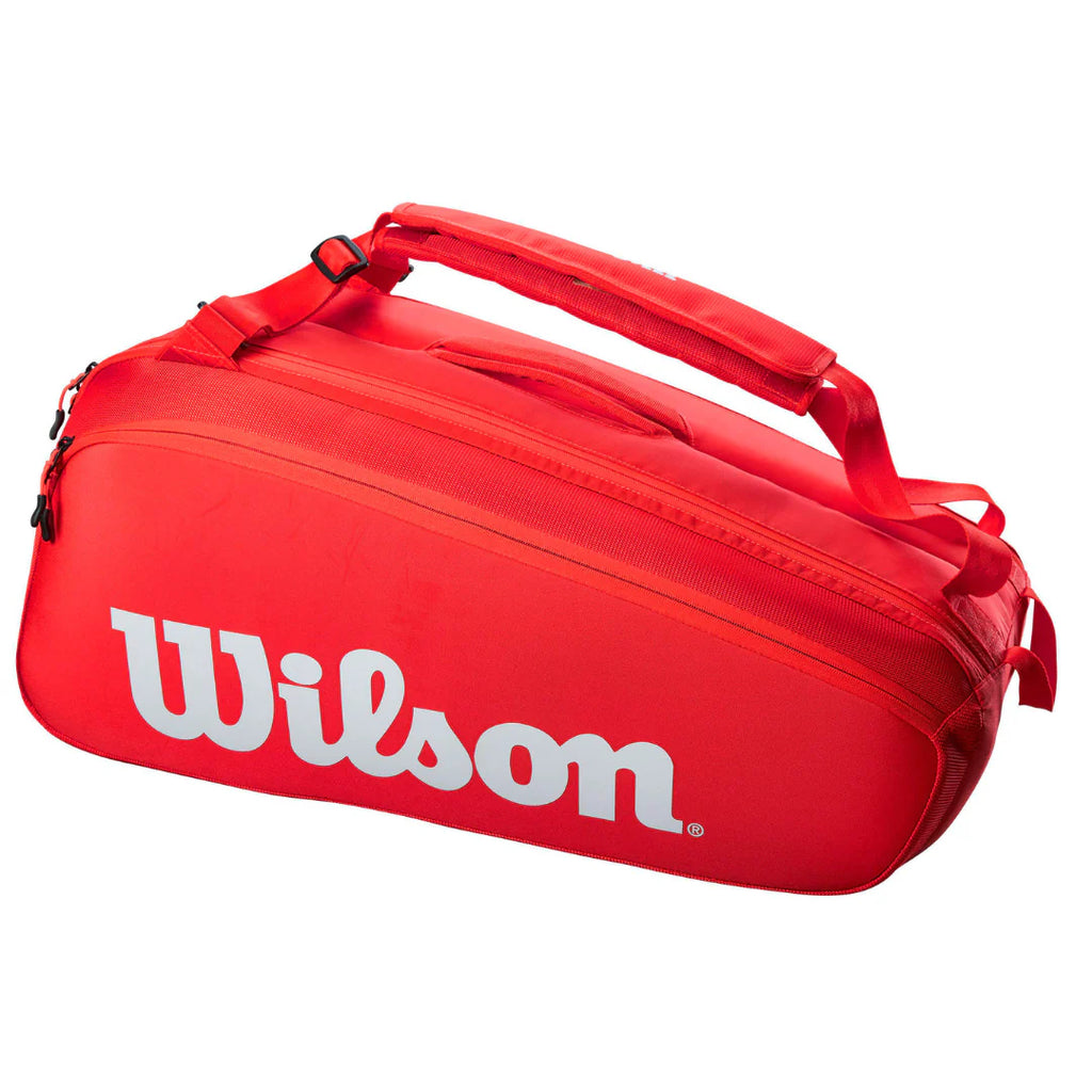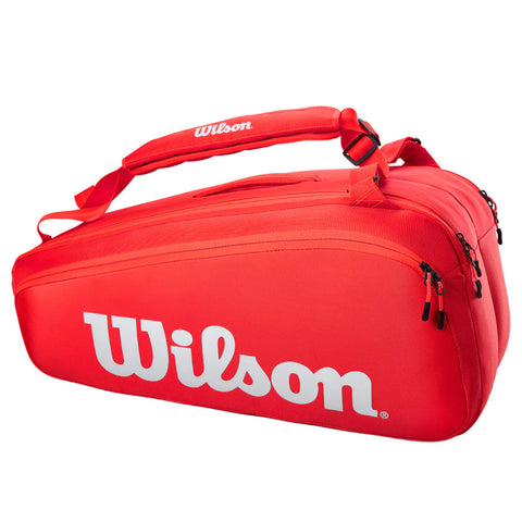 Superior quality, tennis-oriented functionality and classic design collide: introducing Wilson's latest Super Tour bag collection. This bag comprises three main compartments that hold up to 9 racquets, two large exterior side pockets and a dual carry system for optimal transportation. New to the line are reinforced side panels, which provide extra durability at spots that typically rip first. Tennis players will also appreciate the Thermoguard lining in one main compartment that protects contents wilting from extreme heat.